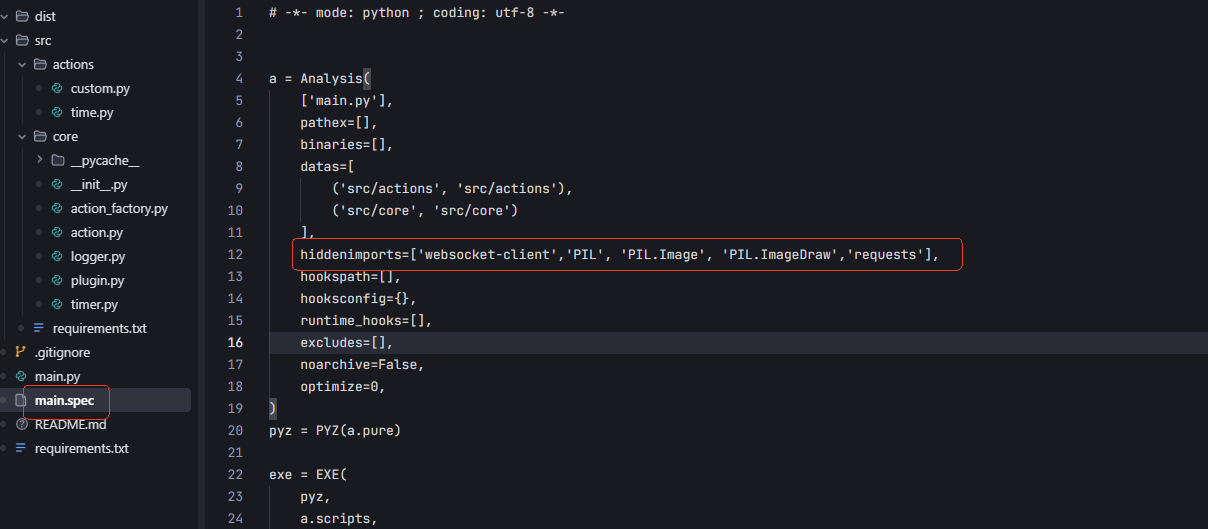 If you encounter module not found errors, this is because action_factory.py uses importlib.import_module to dynamically load classes under actions, and PyInstaller statically analyzes code during packaging. PyInstaller will consider modules only used in action as unused and won't package them into the exe. We can directly add the relevant modules to hiddenimports manually to resolve this.